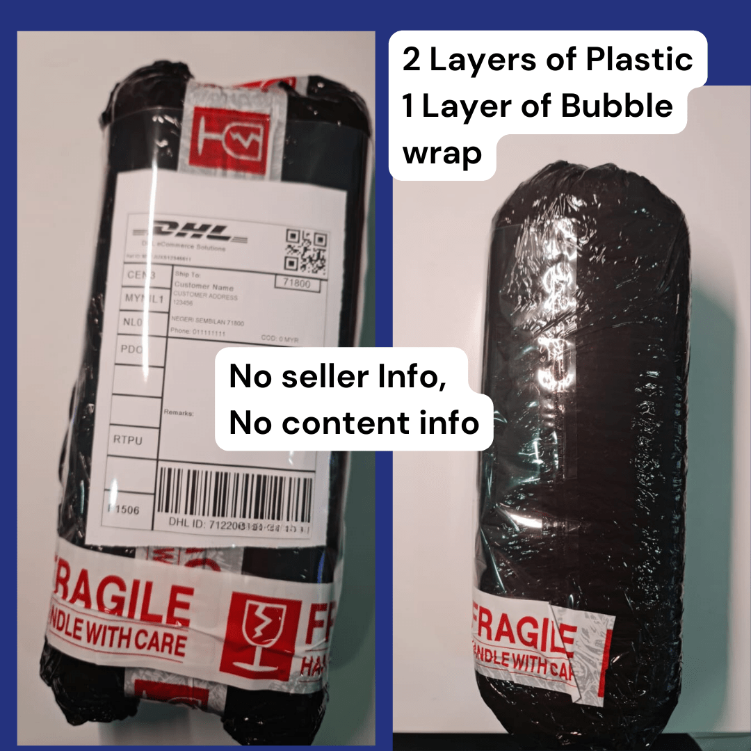 We will package it in a courier bag with one layer of black plastic wrap, one layer of bubble wrap, and another layer of plastic wrap. We will then seal it with tape to ensure that the contents of the parcel will not be revealed in any circumstances, unless someone purposefully tries to open it with a knife or scissors (which is unlikely to happen). Your secret will not be revealed.